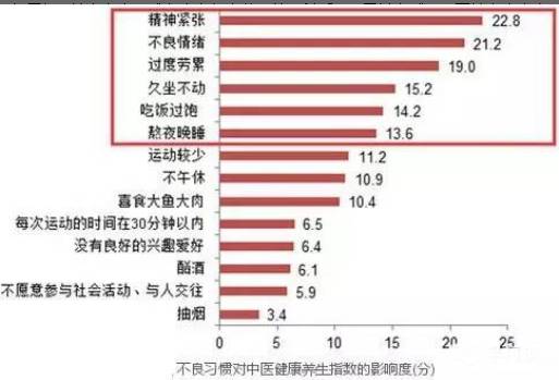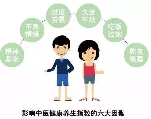 2016年全国城镇居民中医健康状态与养生状况调查结果显示,从养生状况来看,精神紧张、不良情绪、过度劳累、久坐不动、吃饭过饱、熬夜晚睡是影响健康的主要六大因素。其中,精神紧张与不良情绪对健康的影响最大;熬夜晚睡与久坐不动出现的比例最高。