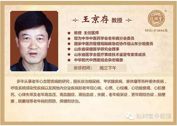 专家简介:王京存主任医师、教授、硕士研究生导师,山东省中医院保健科主任。现为中华中医药学会老年病分会委员,国家中医药管理局胸痹急症协作组山东分组委员,山东省保健医学研究会理事,山东省医学会医疗事故技术鉴定专家库成员,中华现代中西医结合杂志编委。山东省名老中医