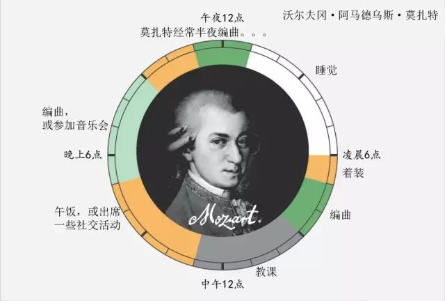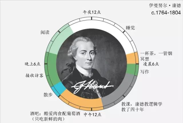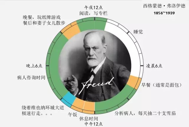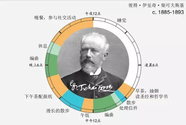 从时间表中可以看出,伟人们并没有像大家想的那样,为了工作、创作而“废寝忘食”,而是作息规律,计划周详。大部分人每天坚持散步及运动,同时保持与人的交流,如去酒吧坐坐、写信、聊天等。安排好时间,作息规律,太重要了!
